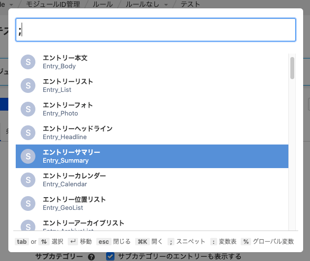 モジュールで使える変数を確認するには、ログイン状態で「⌘K」それから「:」を入力して目的のモジュールを選びます。モジュールのカスタマイズに慣れてきて、何かやりたいことがある場合には変数を確認してみましょう。エントリーサマリーモジュールの変数はこちらでも確認できます。 たとえば「エントリーループの最初だけに表示したい内容がある」場合にはエントリーループの中にある iNum を使って下記のように書きます。